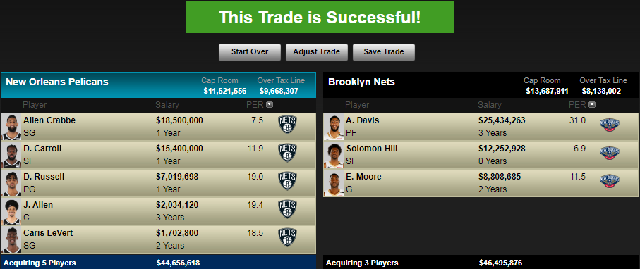 D’Angelo Russell, Jarrett Allen, Caris LeVert, Allen Crabbe, DeMarre Carroll, 2 unprotected 1st-Round Picks (2019 & 2021), and a Pick Swap for 2020 for Anthony Davis, Solomon Hill, and E’Twaun Moore.