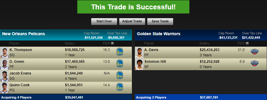 Klay Thomspon, Draymond Green, Quinn Cook, Jacob Evans, and an unprotected 2019 1st-Round Pick for Anthony Davis and Solomon Hill.