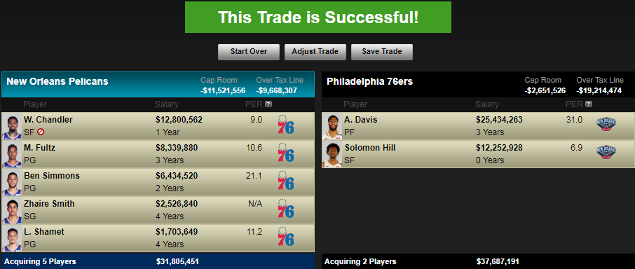 Ben Simmons, Markell Fultz, Landry Shamet, Zhaire Smith, Wilson Chandler, 2021 1st-Round Pick (via Miami), and a 1st Round Picks Swap in 2020 for Anthony Davis and Solomon Hill.
