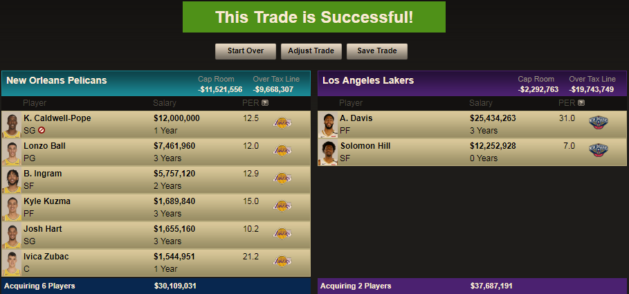 Brandon Ingram, Kyle Kuzma, Lonzo Ball, Josh Hart, Ivica Zubac, Kentavious Caldwell-Pope, Michael Beasley and an unprotected 2019 1st-Round Pick for Anthony Davis and Solomon Hill.